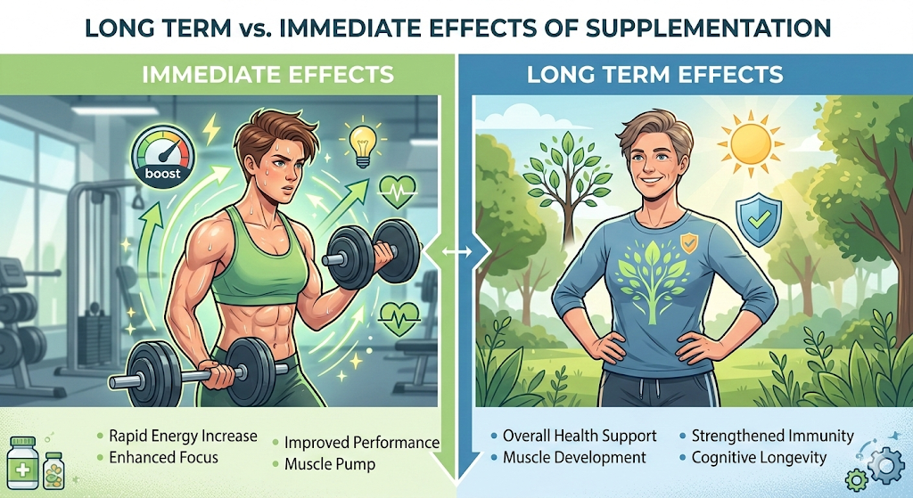 Health supplements tend to focus on the general well-being of the person, supplementing vital nutrients, i.e Vitamin E, Essential Amino Acids, etc. These supplements focus on the internal health of a person, it's like adding engine oil when the check engine light on your car lights up or taking it to a mechanic to get it fixed.
