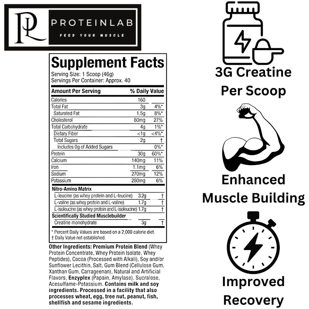 - Protein 30g, Creatine 3g, BCAAs 6.8g, Glutamine & Precursor (per serving)
